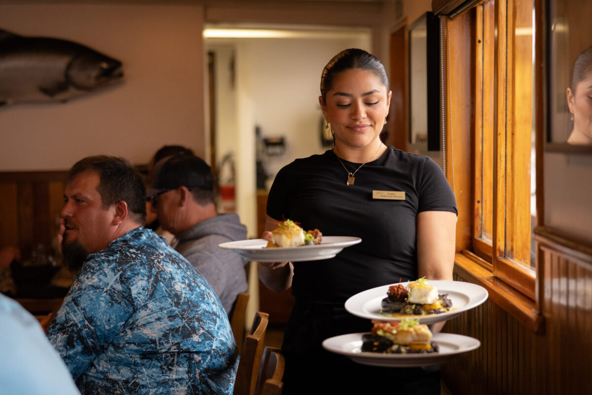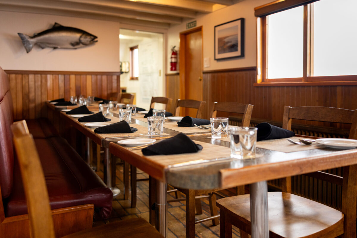 The location of the Lodge inside sheltered Naden Harbour necessitated daily travel to and from the fishing grounds of about 20 minutes each way. In answer to the travel challenge, hospitality services were extended to the fishing grounds in the form of the MV Driftwood, a 100-foot vintage wooden vessel, anchored in calm water near the fishing action. Initially the ship provided only lunch, snack, bathroom and safety services, but demand soon necessitated development of accommodation on board.